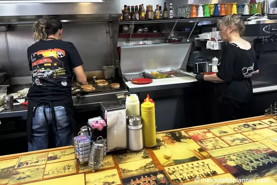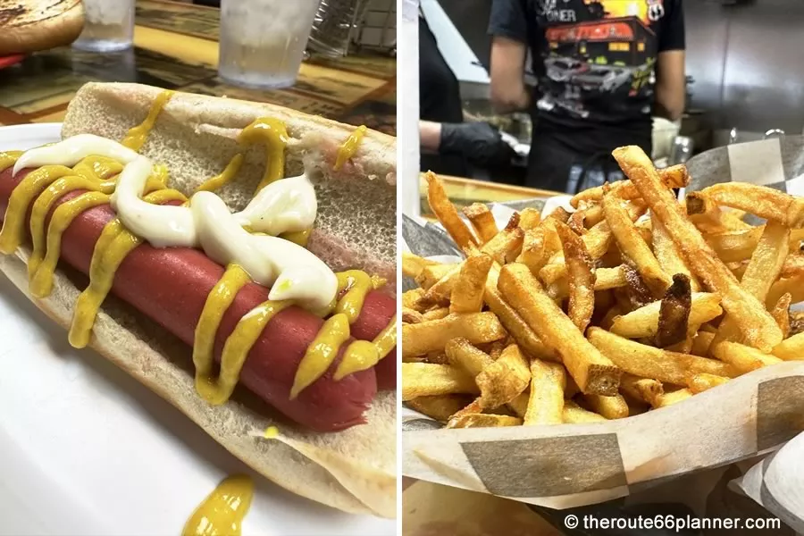 From the moment we stepped inside Sid’s Diner, the experience was overwhelming. The air was filled with the smell of sizzling onions, fresh burgers, hot fries, and coffee brewing. The chatter of locals, the jukebox tunes, and the colorful walls lined with photos and Route 66 memorabilia transported us straight into another era. It was exactly what a road trip diner should feel like: warm, lively, and inviting.